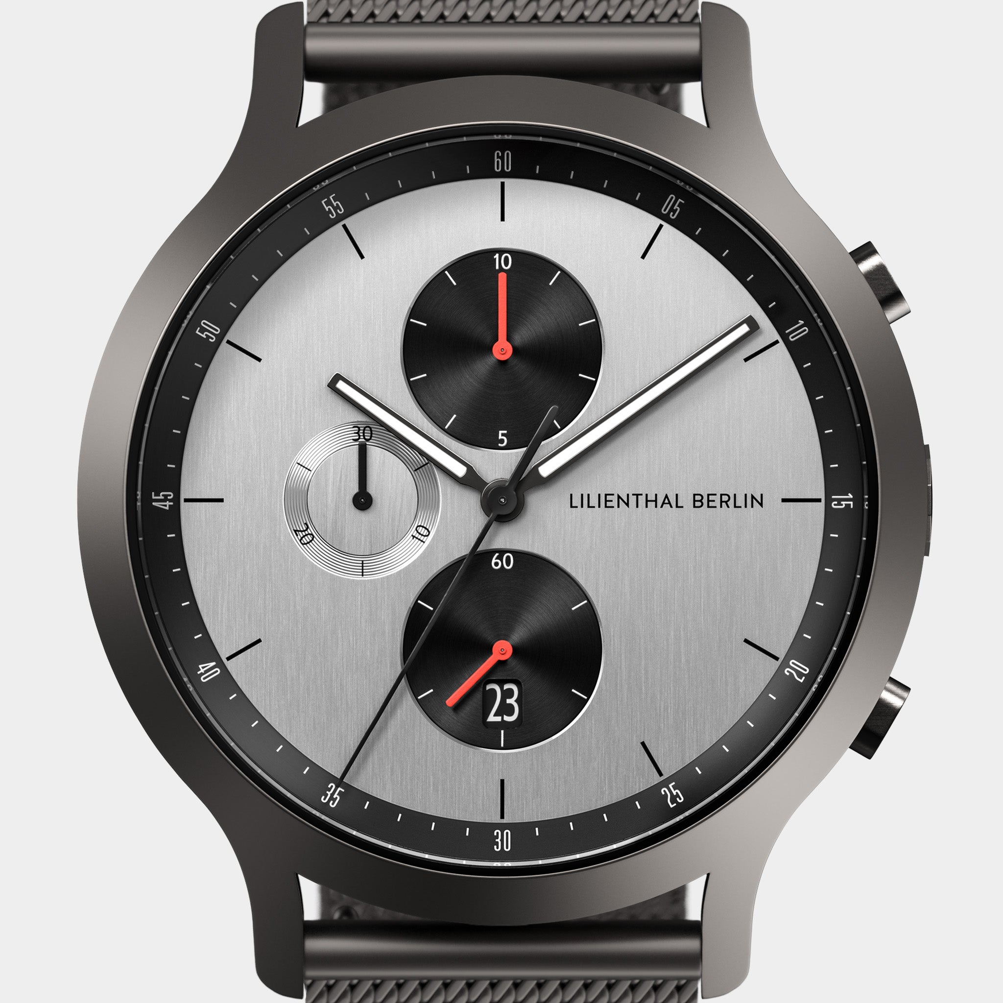 Scopri la nostra collezione di orologi cronografi, dove la funzionalità incontra il design moderno. Un orologio cronografo offre più del semplice orario: dispone di una funzione cronometro integrata, che ti consente di misurare il tempo trascorso con precisione e facilità. Progettati con precisione e attenzione ai dettagli, questi orologi cronografi combinano caratteristiche pratiche con un'estetica senza tempo. Ogni cronografo include quadranti secondari disposti chiaramente per visualizzare secondi, minuti e misure cronometro precise. Materiali di alta qualità, come le casse in acciaio inossidabile 316L e il vetro minerale indurito zaffiro, garantiscono durata ed eleganza raffinata. Lancette e indicatori luminosi su ogni orologio cronografo migliorano la leggibilità, anche in condizioni di scarsa luminosità. Che sia per l'uso quotidiano o per occasioni speciali, i cronografi di Lilienthal Berlin sono progettati per la versatilità. Con cinturini intercambiabili in pelle, acciaio inossidabile e alternative vegane, puoi personalizzare il tuo orologio cronografo per adattarlo al tuo stile personale. Esplora la collezione di orologi cronografi e scopri il perfetto connubio di precisione, stile e funzionalità. Trova un cronografo che rifletta la tua individualità e resista alla prova del tempo.